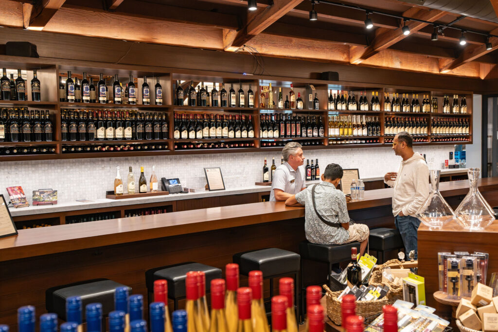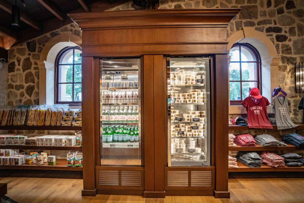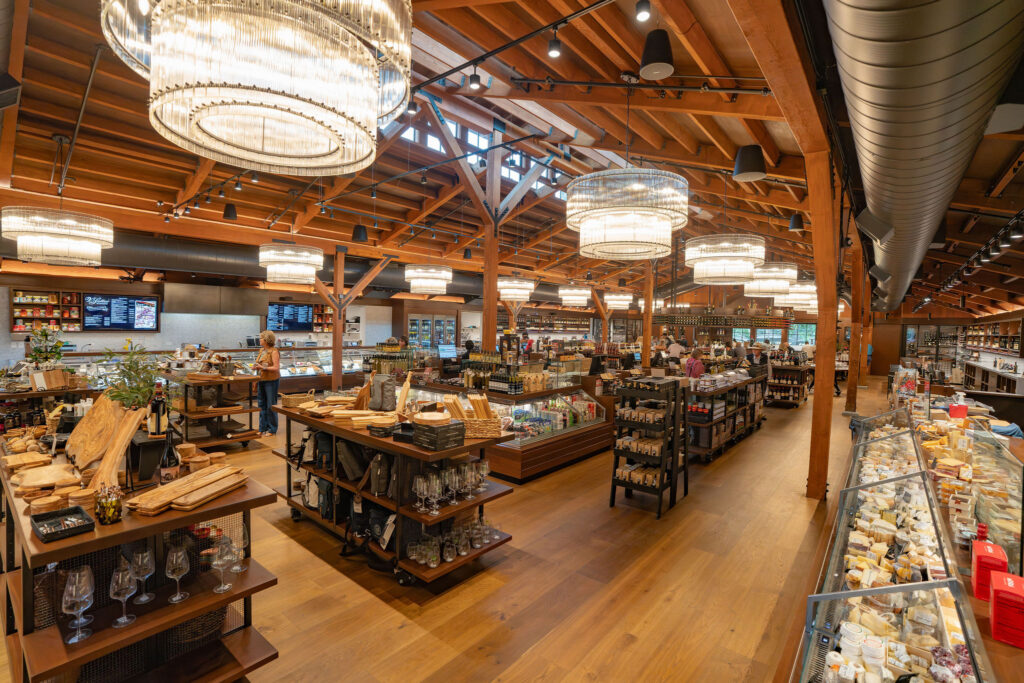You arrive through a broad stone façade. Inside, vaulted ceilings, redwood beams, and wide plank floors welcome you into what might be called picnic luxury. The old picnic lawn still stretches outside, but the heart of the experience is now this indoor space with cheese displayed across twenty six feet of refrigerated shelving. Four separate tasting bars stand ready. The mosaic of food, wine, and leisurely browsing feels carefully choreographed yet retains the casual ease that drew visitors in the first place.