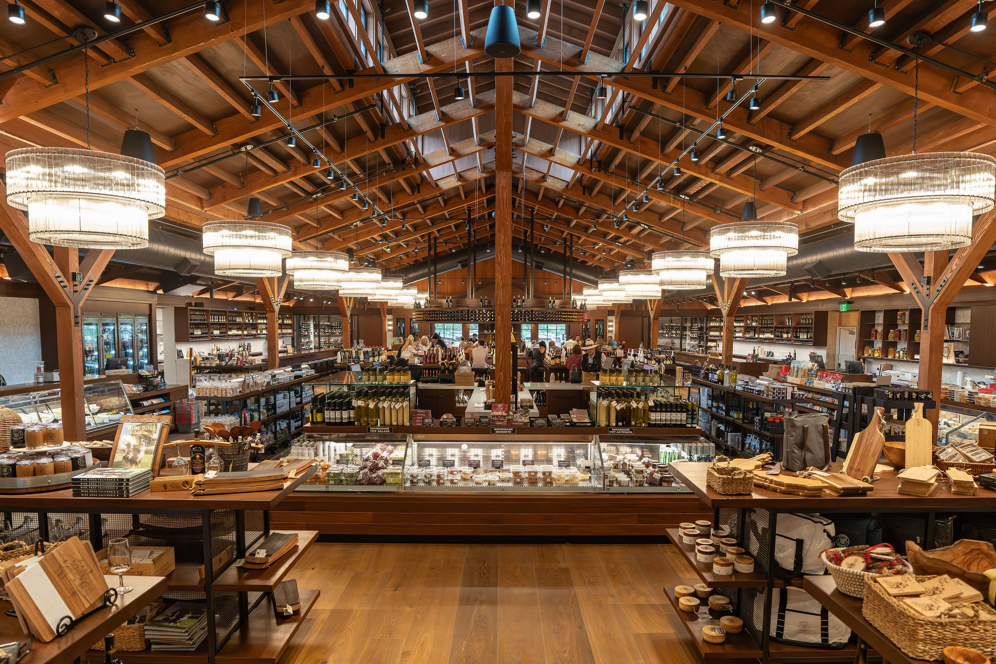 You arrive through a broad stone façade. Inside, vaulted ceilings, redwood beams, and wide plank floors welcome you into what might be called picnic luxury. The old picnic lawn still stretches outside, but the heart of the experience is now this indoor space with cheese displayed across twenty six feet of refrigerated shelving. Four separate tasting bars stand ready. The mosaic of food, wine, and leisurely browsing feels carefully choreographed yet retains the casual ease that drew visitors in the first place.